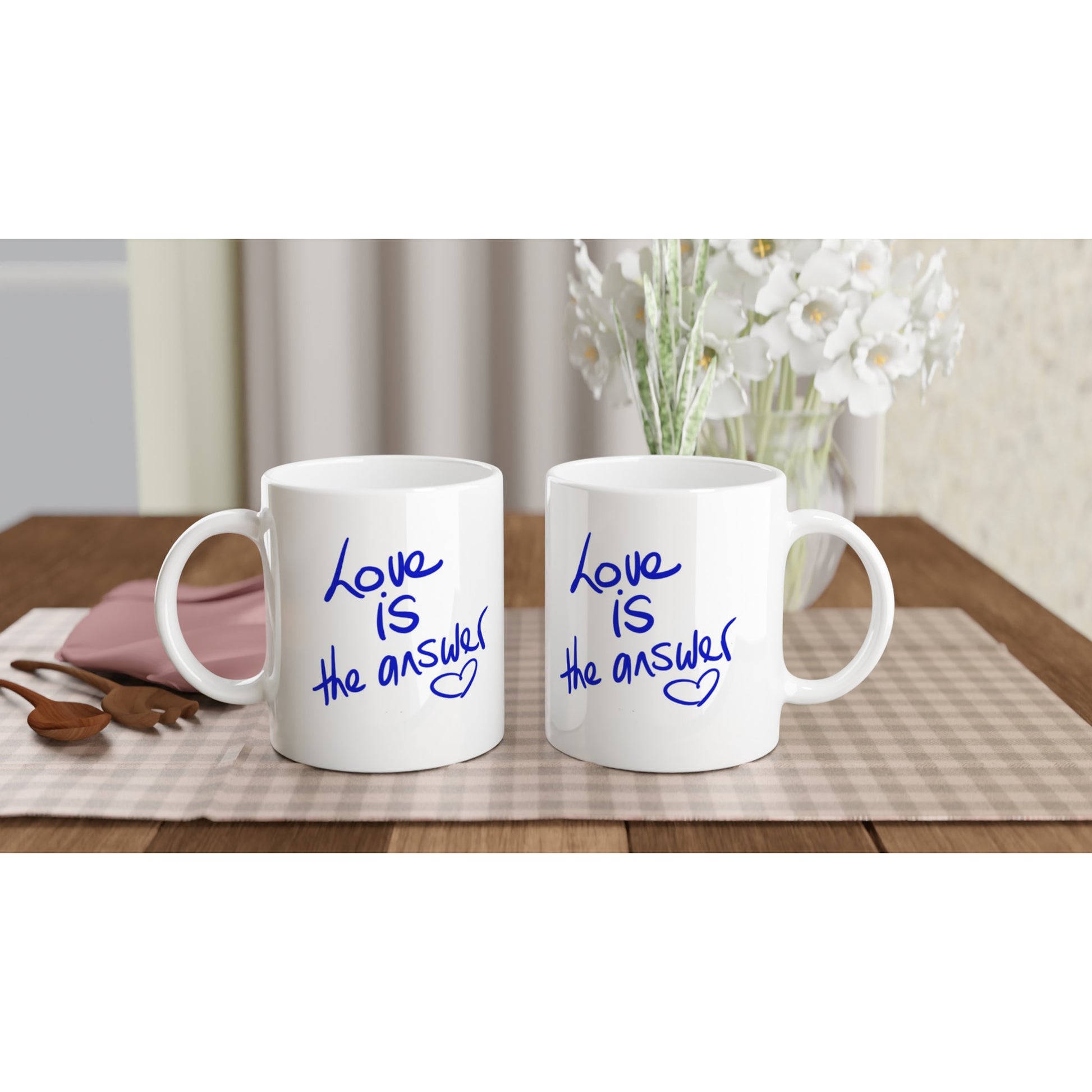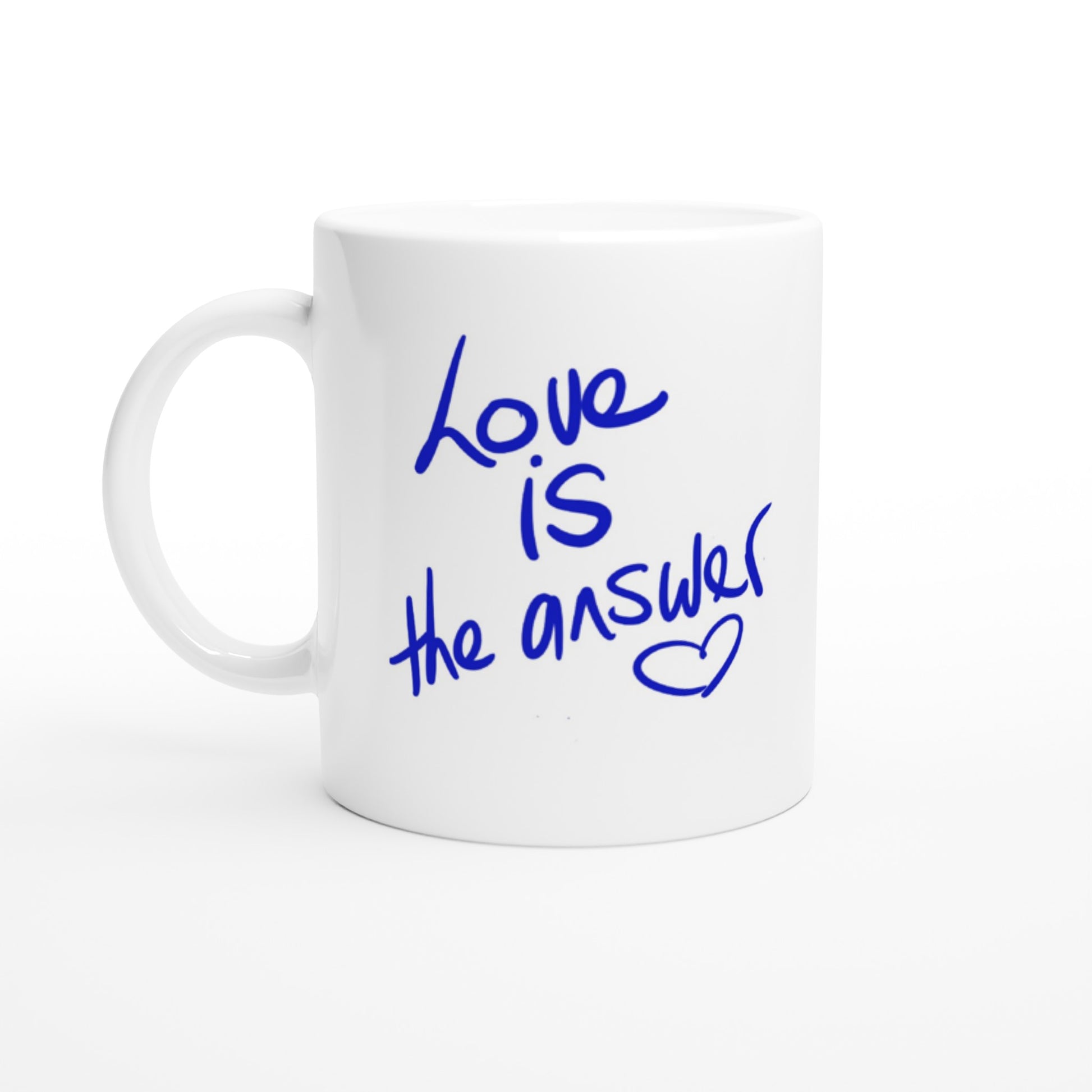 "Love is the Answer" 11 Oz white ceramic mug (both sides print). Free Shipping.