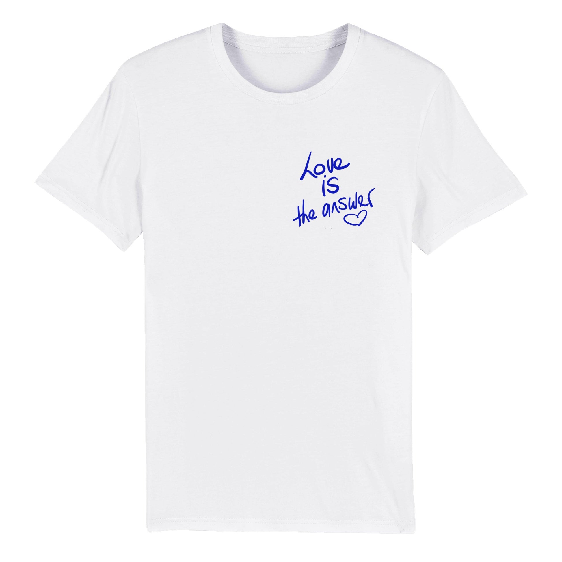 'Love IS the answer' Organic Unisex Crewneck T-shirt (blue on white - pocket print). Free Shipping.